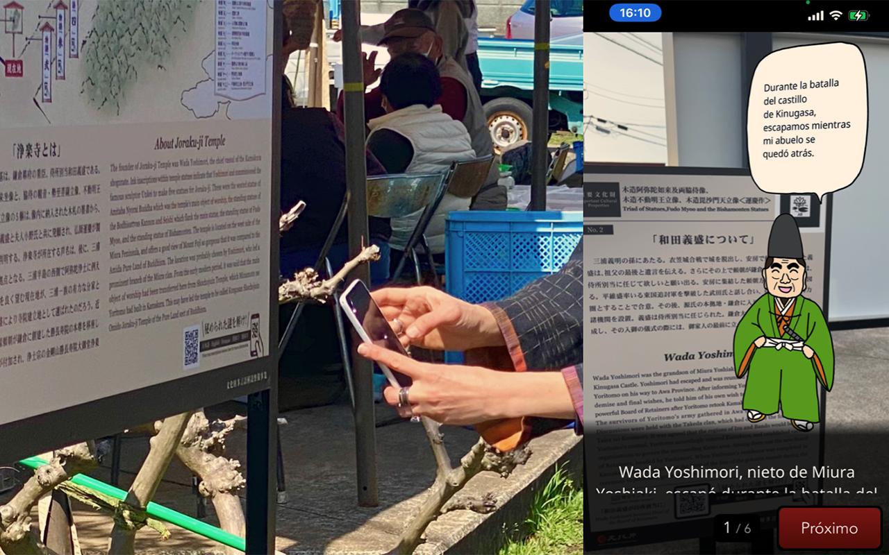 スマートフォンを通して、浄楽寺の境内に配置されている多言語看板から、お寺の歴史や運慶作仏像のことなどが描かれているAR歴史マンガを観ることができます。(浄楽寺境内)