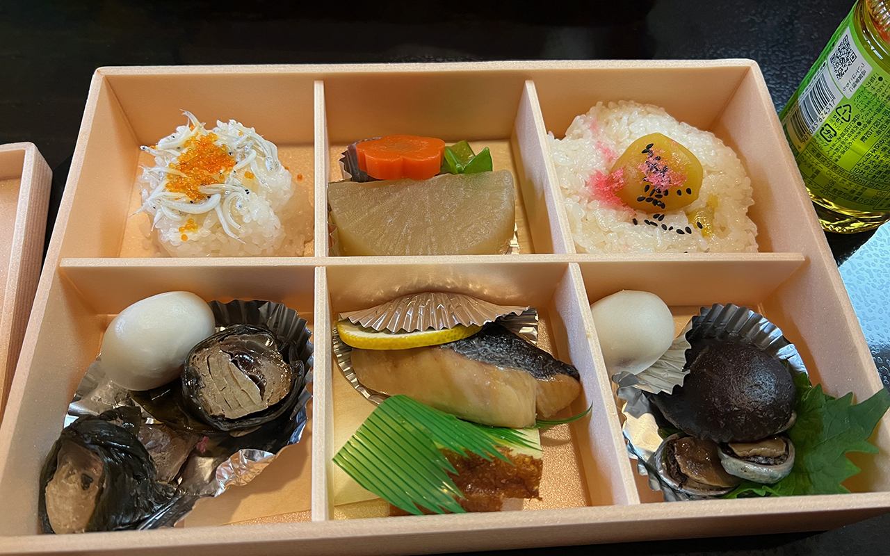 浄楽寺にバスで移動して、浄楽寺書院にて、当時の武士が軍に赴く際に戦勝を祈願しておこなった三献の儀(打ち鮑、勝ち栗、喜こぶ)にちなんで、鮑の替わりのとこぶし、栗、昆布を使った「軍めし弁当」か精進料理(とこぶしをしいたけで代用)の「願めし弁当」を武士の気持ちになって味わっていただきます。(浄楽寺書院)