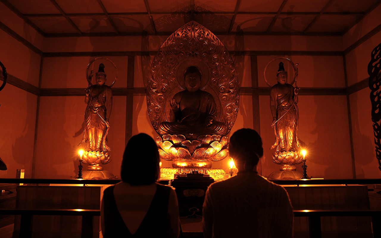 鎌倉時代同様に、蝋燭の灯りのみで参拝する暗闇参りができる浄楽寺。仏像は運慶作の国の重要文化財5体です。僧侶の読経が響き渡る中、命の駆け引きをせざるを得なかった武士の心情に迫ります。(浄楽寺収蔵庫)
