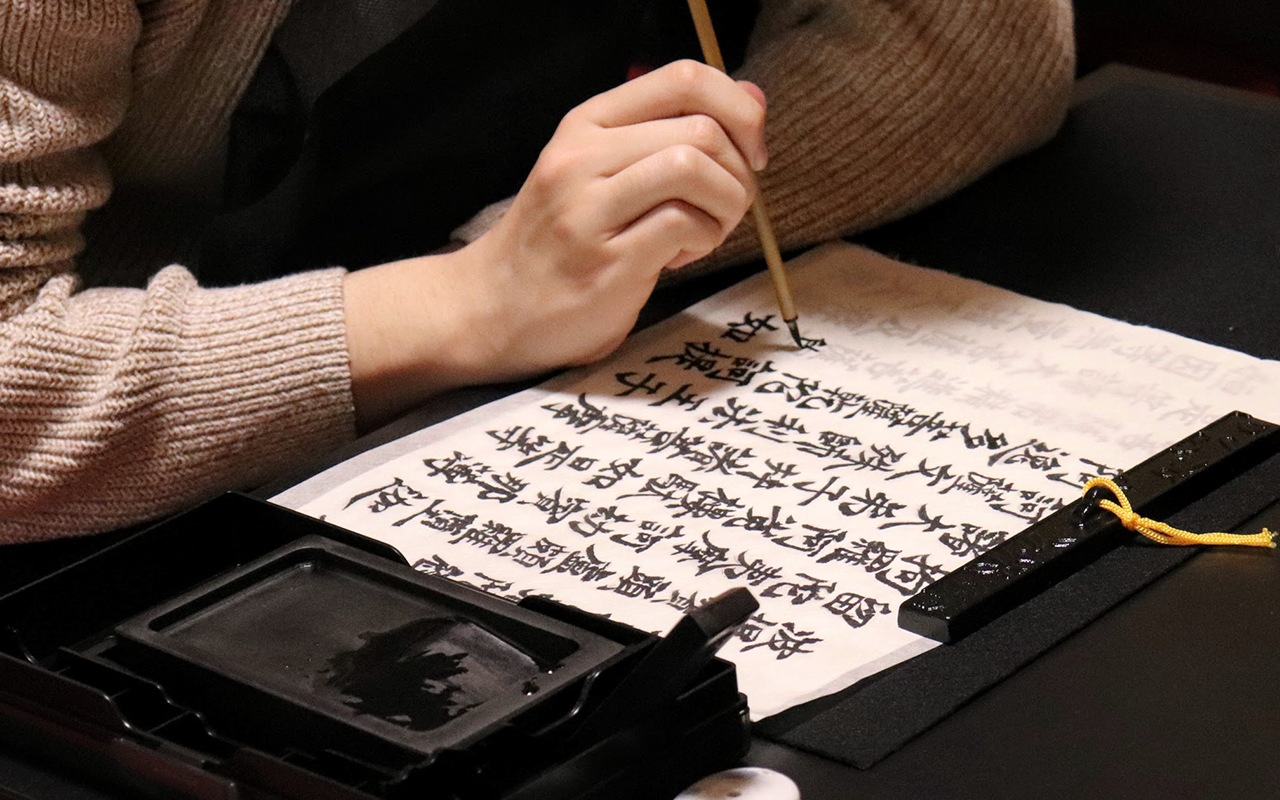 昼食後、浄楽寺にて本尊阿弥陀如来の功徳を伝える阿弥陀経の写経を体験します。墨を擦りながら心を整え、すかした和紙に毛筆でなぞりながら写経を行い、往時の武士達が仏に願ったように、ご自分の願いも写経に込めます。(浄楽寺書院)
